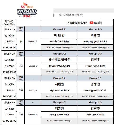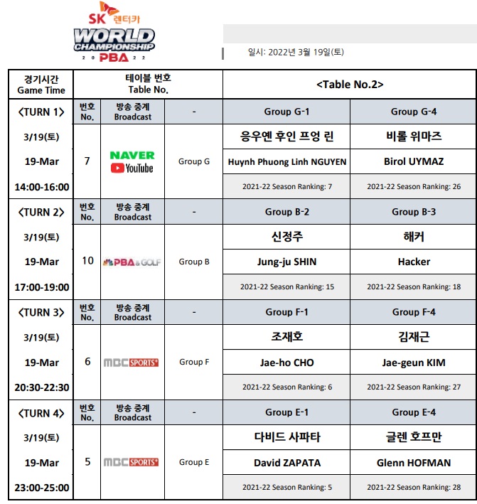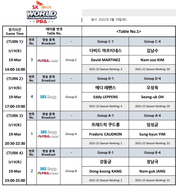 3월 19일 펼쳐지는 SK렌터카 PBA-LPBA 월드 챔피언십 2022 프로당구대회 32강 예선리그전 대진표의 1일차 당구경기의 경기시간은 아래와 같습니다. TV중계방송 채널은 각 도표의 방송사를 참고하시기 바랍니다.