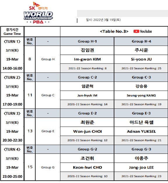 3/19(토) 가장 늦은 시간인 밤 10시30분부터 새벽 1시까지 예정되어 있는 SK렌터카 PBA 월드 챔피언십 2022 예선 리그전 대진표에도 눈길을 뙬 수가 없습니다. PBA에서 활동중인 가장 많은 우승기록 2회를 기록하고 있는 강동궁 선수와 신예 장남국 선수위 경기와 지난 시즌 월드챔피언 다비드 사파타와 PBA원년부터 PBA에서 활동하고 있지만 아직 무관인 글렌 호프만 선수의 경기도 예정하고 있습니다.