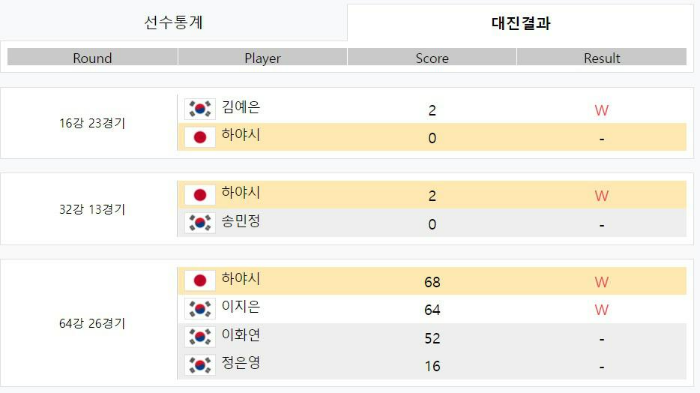 64강 26경기 : 하야시 68 W 이지은 64 W 이화연 52 - 정은영 16 -