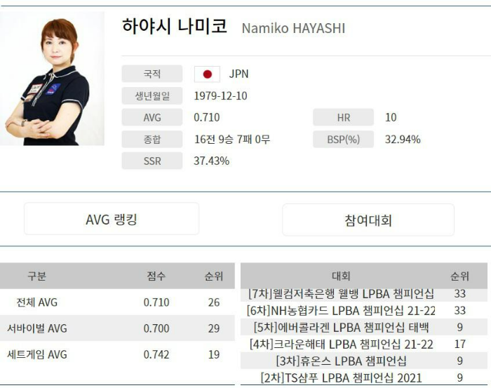 에버콜라겐 LPBA 챔피언십2021 태백 대회- 하야시 나미코 선수 대진결과를 보면 하야시 선수는 64강에서 이지은 이화연 정은영 당구선수와 한조에서 펼친 서바이벌 3쿠션 당구경기에서 68득점 조 1위로 32강에 올랐습니다.