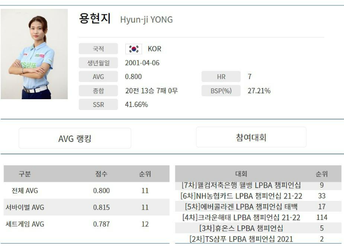 특히 올시즌 참여대회에서는 2차 투어인 TS샴푸 LPBA챔피언십에서 결승에 오르면서 확실히 내가 용현지다라고 각인을 시켰습니다. 이후에 다소 부진한 성적을 보이다가 지난 7차투어에서 다시 16강까지 오르며 왕중왕전 참가자격을 확보하고 기대감을 높혔습니다.