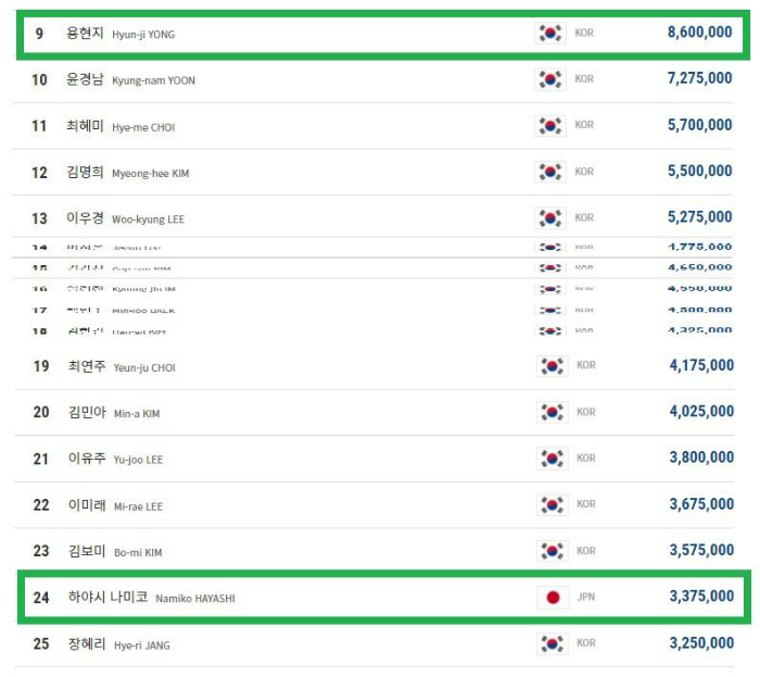용현지 vs 하야시나미코 당구선수 LPBA 여자당구 상금랭킹