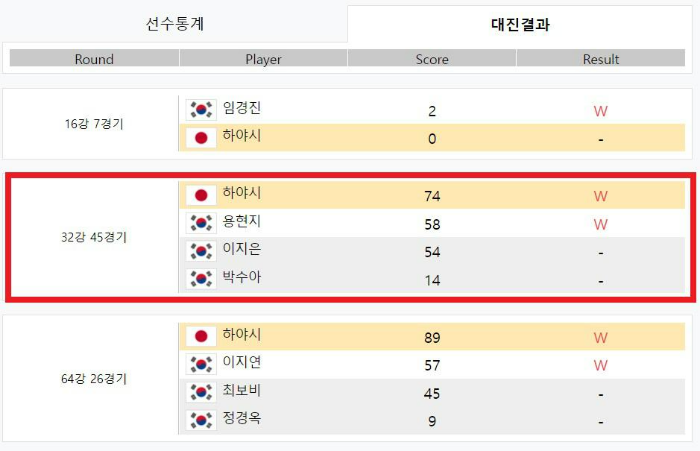 32강 45경기 : 하야시 74 W 용현지 58 W 이지은 54 - 박수아 14 -