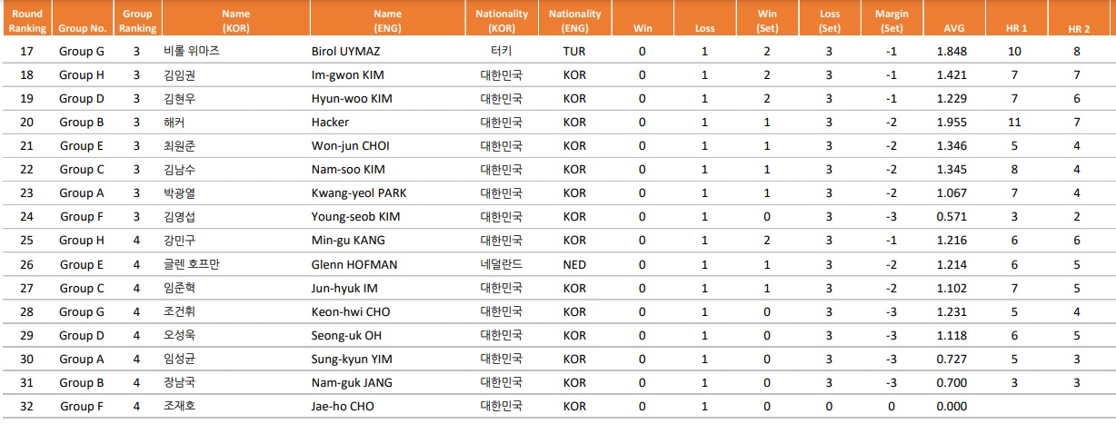 앞서 열린 32강 조별리그 제1, 2경기에서는 다비드 마르티네스(스페인∙크라운해태)를 비롯해 하비에르 팔라존(스페인∙휴온스) 마민캄(베트남∙신한금융투자) 응우옌 후인 프엉린(베트남∙NH농협카드) 에디 레펜스(벨기에∙SK렌터카) 신정주(신한금융투자), 주시윤, 강승용이 나란히 첫 승을 챙겼습니다. 한편, F조에서는 조재호(NH농협카드)가 ‘코로나19’ 확진으로 출전이 아쉽게 무산되면서 김재근(크라운해태)이 부전승으로 1승을 차지하게 됐습니다.
