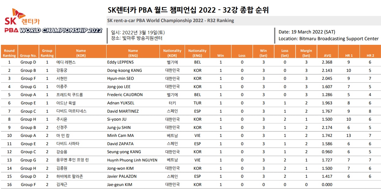 | SK렌터카 월드챔피언십 2022 왕중왕전 32강 1일차 경기에서 1승 승점을 챙긴 남자 프로당구 선수 16명은 에디 레펜스, 강동궁, 서현민 당구 선수 , 이종주 당구선수, 프레드릭 쿠드롱, 아드난 육셀, 다비드 마르티네스, 주시윤, 신정주, 마 민 캄, 다비드 사파타, 강승용, 응우옌 후인 프엉 린, 김종원, 하비에르 팔라존, 김재근 선수입니다. 참고로 김재근 선수는 조재호 선수 불참으로 부전승으로 1승을 챙겼습니다. |