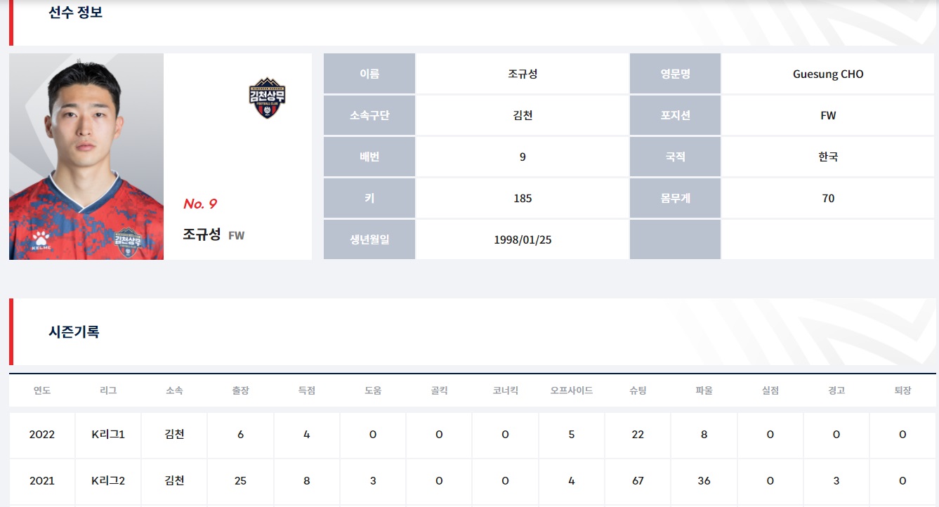 3월 21일자 기준 K리그 득점 랭킹 1위 조규성 선수의 축구 프로필 정보입니다.