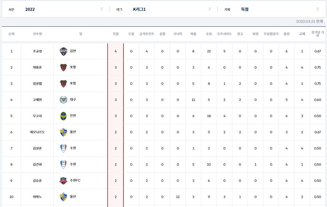 3월 21일자 기준 K리그 득점 랭킹 1위는 조규성 2위는 허용준 3위는 임상협 4위 고제현 축구 선수입니다.
