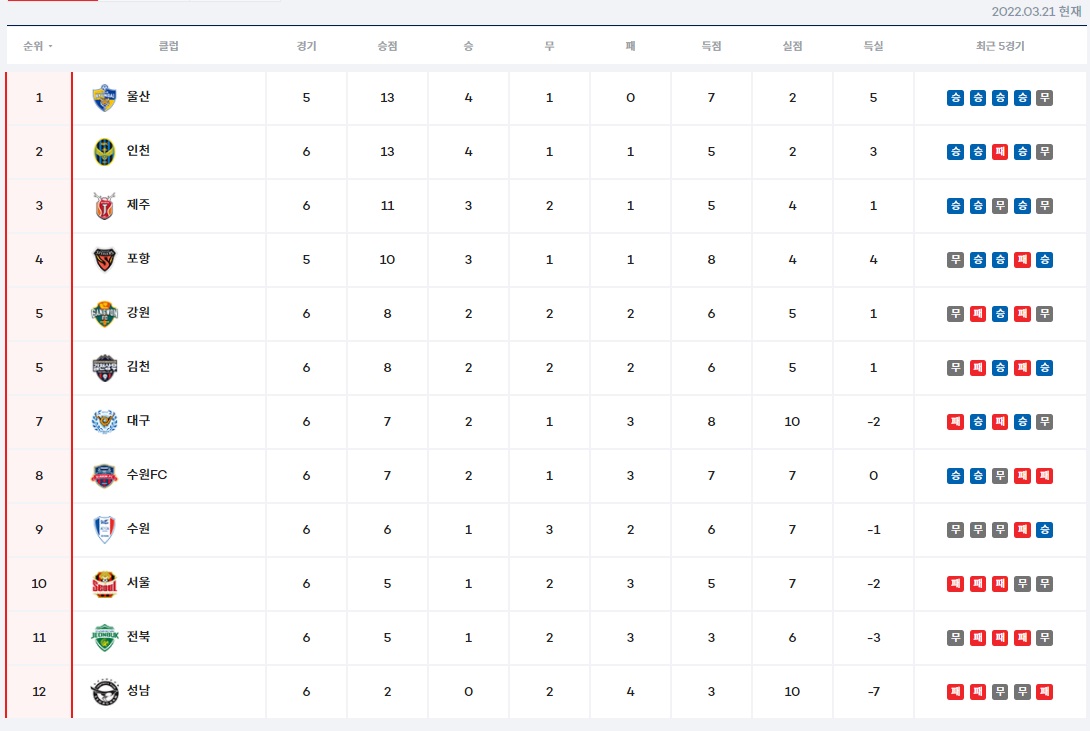 3월 21일자 기준 K리그 중간 순위 1위는 울산FC 2위는 인천FC 3위는 제주FC입니다.
