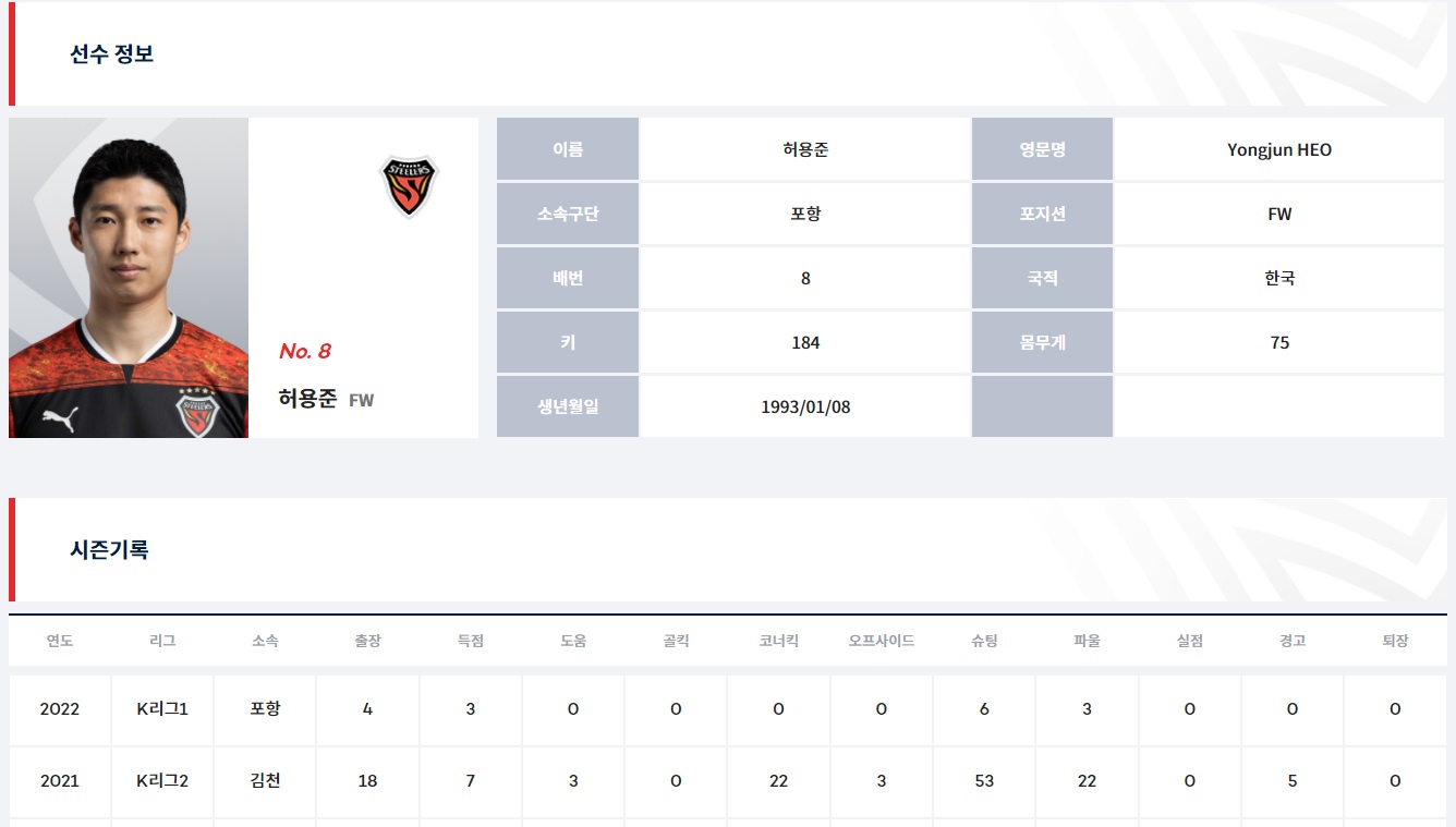 3월 21일자 기준 K리그 득점 랭킹 2위 허용준 선수의 축구 프로필 정보입니다.