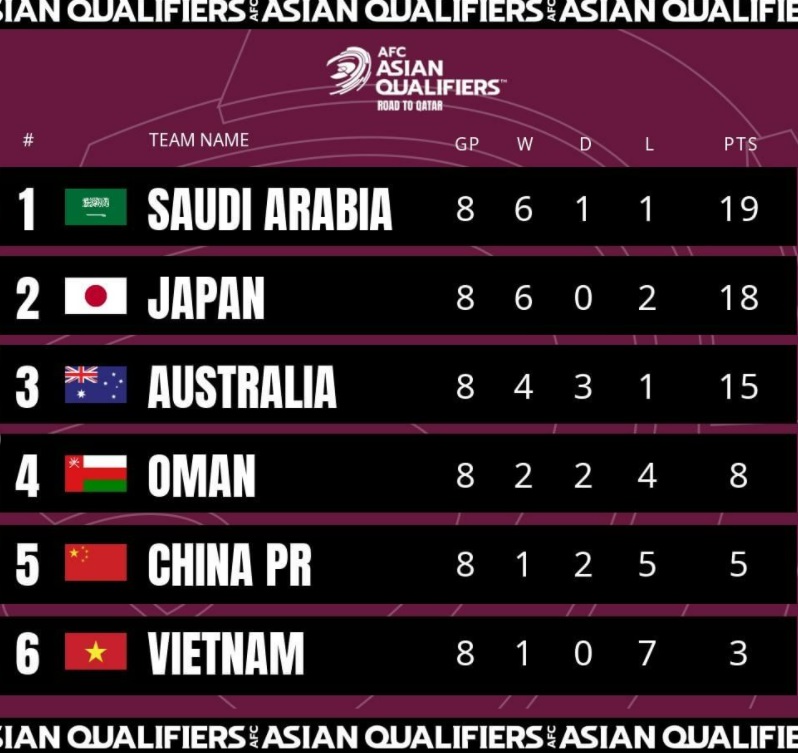 사우디아라비아와 마찬가지로 호주는 개막전 3경기부터 최고득점을 올리며 맹렬한 출발을 보였지만 그 이후 부진을 면치 못하고 있습니다. 그들은 베트남과의 경기에서 4-0으로 승리하며 7번째 경기에서 승리를 거두었습니다. 하지만 오만과의 경기에서 2-2 무승부는 그들이 자동적으로 자격을 얻기 위해 다음 두 경기에서 반드시 승리해야 한다는 것을 의미합니다.