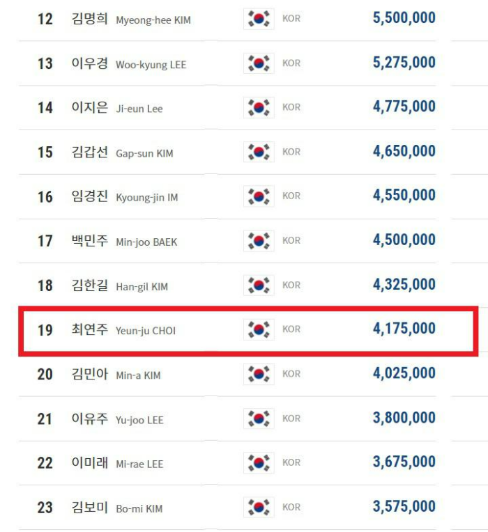 상금랭킹/이름/국적/상금(원) 순입니다.