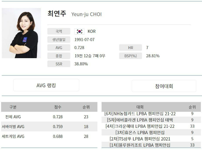 최연주 선수의 올시즌 2021-22 LPBA투어 대회 전적은 19전 12승 7패입니다. 하이런은 8개, 뱅크샷 득점비율인 BSP는 28.81%로 상당히 높은 편입니다. 즉 2득점을 얻을 수 있는 뱅크샷을 잘 치는 선수가 LPBA에서는 매우 유리한데 최연주 당구선수 가능성이 큽니다.