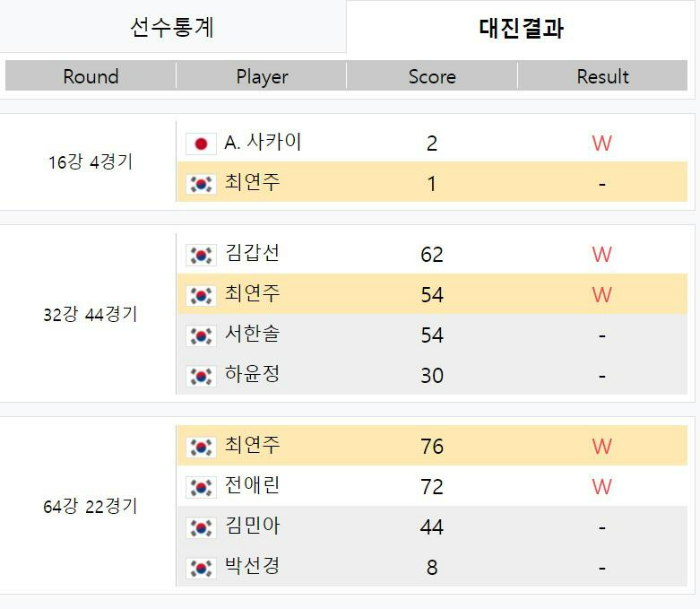 64강 34경기 : 최연주 72 W 김민아 64 W 박효선 32 - 오지연 32 -