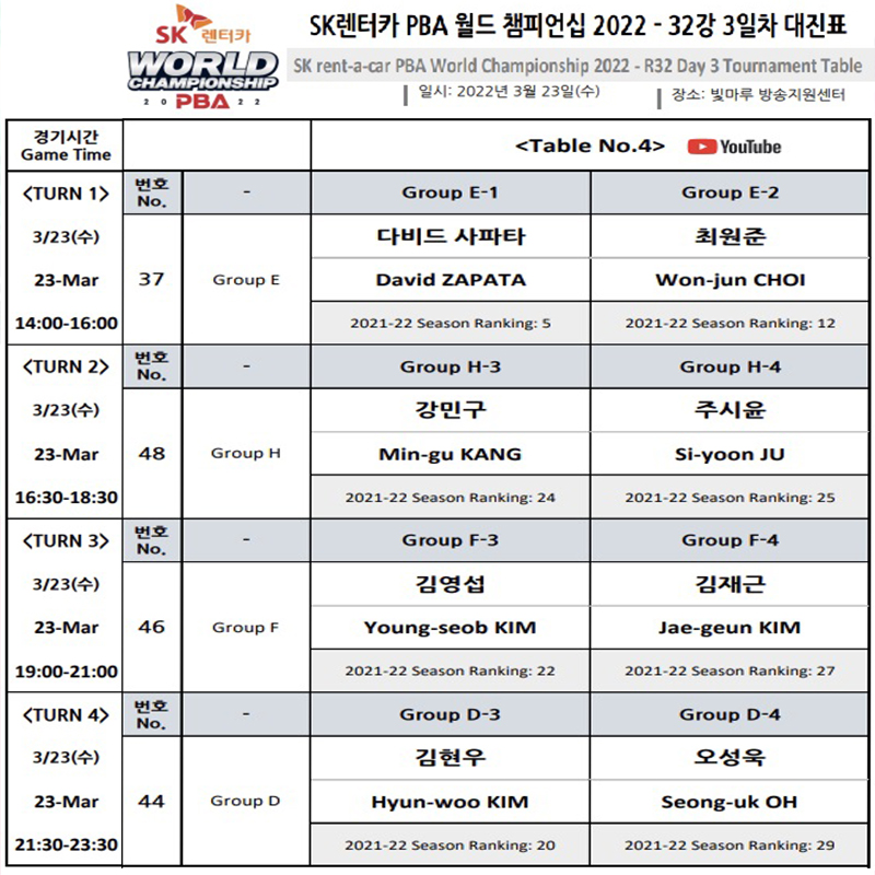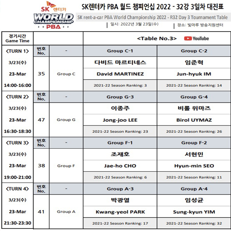 SK렌터카 PBA 월드 챔피언십 2022 - 32강 3일차 대진표 경기시간