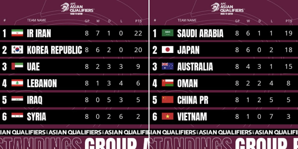 카타르 월드컵으로 가는 AFC 아시아 지역 최종 예선 A조 순위 2022년 11월 부터 열대의 나라 카타르에서 열리는 2022 카타르 월드컵으로 가는 AFC 아시아 지역 최종 예선전의 현재 A조 순위는 이란이