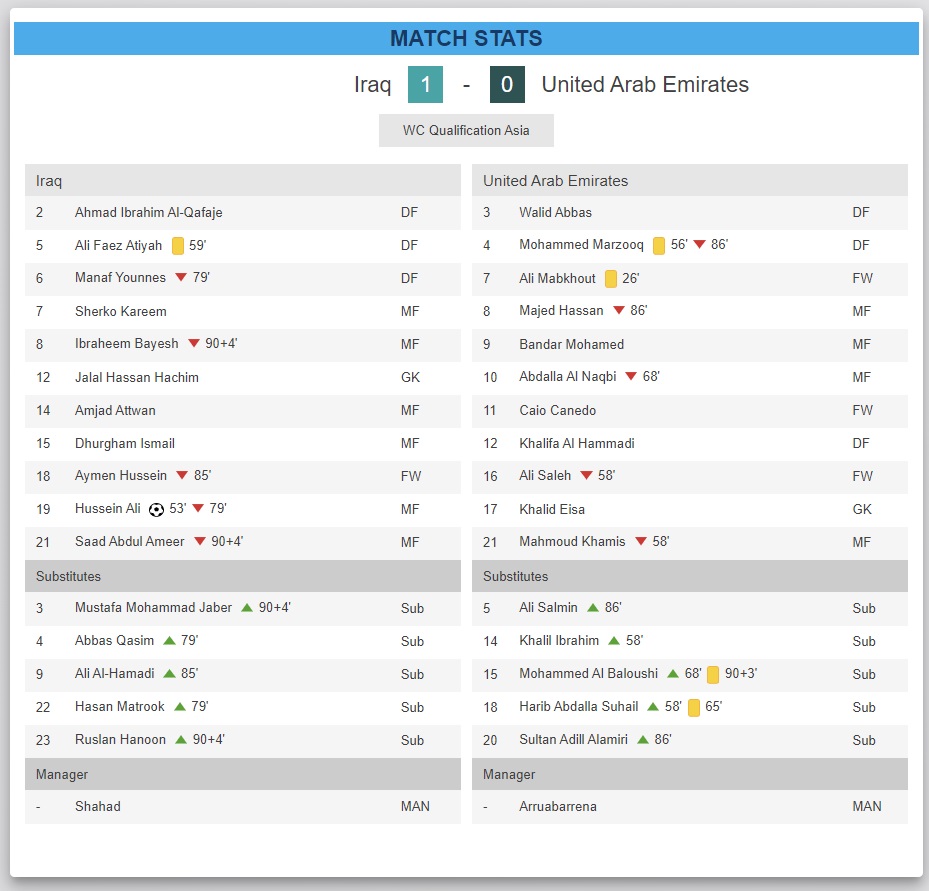 UAE의 로돌포 아루아바레나, 이라크의 압둘가니 샤하드는 각각 더그아웃 데뷔전에서 이전 선수들에게 5번의 변화를 주었지만, 두 선수의 행복한 출발을 즐긴 것은 메소포타미아 라이온스 감독이었습니다.초반 경기는 이라크가 전반 15분 암자드 아트완의 장거리 공격과 아흐메드 이브라힘의 헤딩슛을 위협하면서 득점 기회를 거의 얻지 못했습니다.