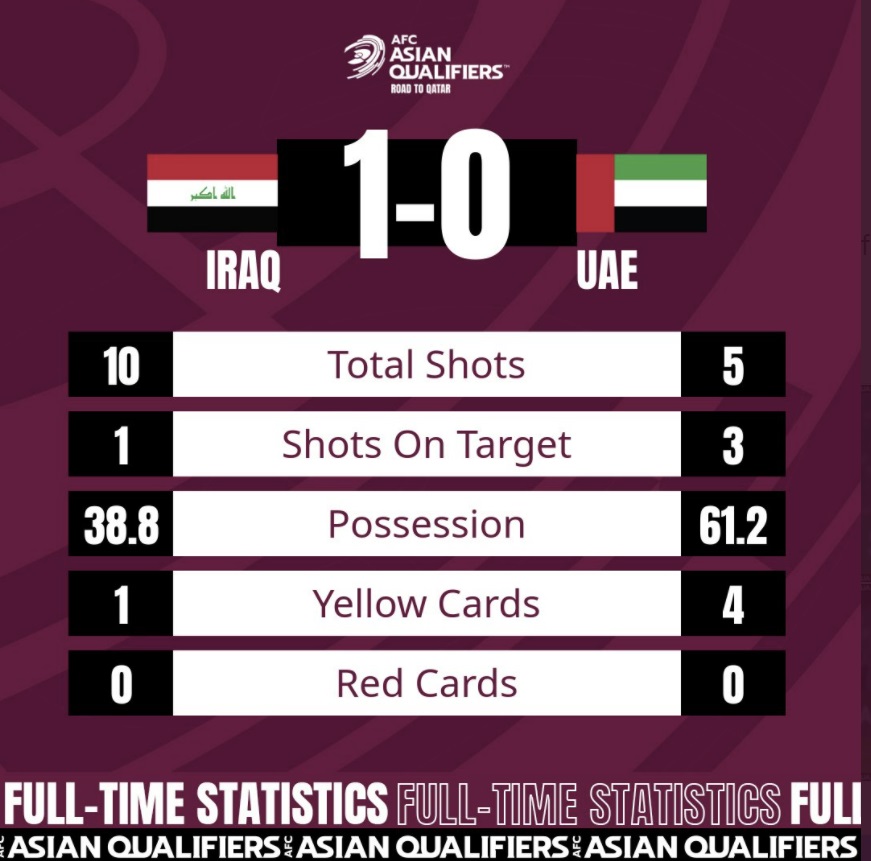UAE가 볼점유율에서는 두배 가까이 앞서고 유효 슈팅수에서도 앞섰으나 결과적으로 1:0으로 패배하였습니다. 3월 29일 카타르 월드컵 아시아 지역 최종예선 10차전 한국 UAE전에서 UAE는 본선진출은 불가능한 상태이지만 1승을 위해 최선을 다 할 것으로 예상됩니다.