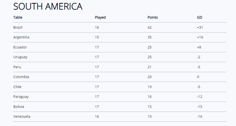 남미 지역에서 카타르 2022에는 4~5개 팀이 CONMEBOL을 대표할 것입니다. 현재 남미지역에서 월드컵 본선 진출 확정국가는 아르헨티나, 브라질, 에콰도르, 우루과이입니다. 남미에서는 상위 4개 팀이 월드컵 출전권을 확보했습니다. 5위를 차지한 선수들은 아시아 선수들과 대륙간 플레이오프를 치르게 됩니다.