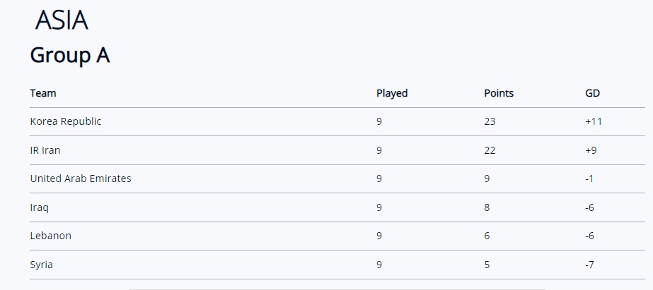 카타르월드컵 아시아 지역 최종예선 A조 최종 순위