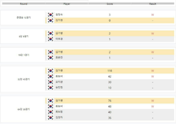 32강 45경기: 김가영 118 W 최보비 42 W 오지연 30 - 송민정 10 -
