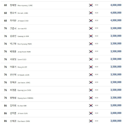 *Rank / Name / Nationality / Official Money(KRW) 순서입니다.