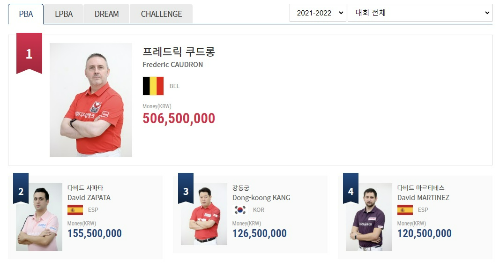 1위는 벨기에 당구선수 프레드릭 쿠드롱으로 쿠드롱 당구선수는 올시즌 정규 PBA투어에서 3차례 연속으로 우승(총상금 3억)하고 바로 이어 지난 3월 남자프로당구 왕중왕전에 해당하는 PBA월드챔피언십 2022에서 우승(우승상금 2억원)하였습니다.
