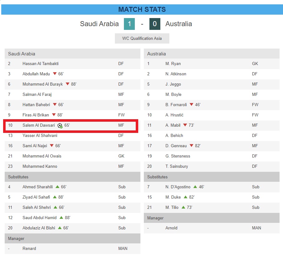 카타르월드컵 아시아지역 최종예선 3월 29일 10차전 B조 경기결과, 사우디아라비아가 호주를 제치고 1위를 차지했습니다. 살렘 알 도사리의 후반전 페널티킥은 압둘라 킹 스포츠 시티 스타디움에서 사우디가 3월29일 화요일 호주와의 아시아 예선 B조 로드 투 카타르에서 1-0으로 승리하며 1위를 굳히는 골이 되었습니다.