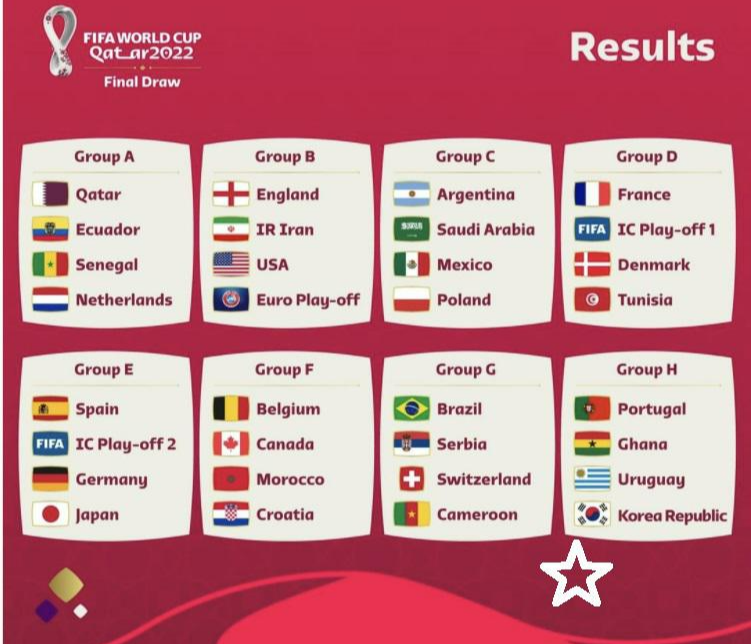 | 2022 카타르 월드컵 조추첨 결과 - 한국 조편성 결과는 포르투칼 가나 우루과이와 H조 편성 (일본 독일 E조, 이란 영국 B조, 사우디 아르헨 C조) (0) | 2022.04.02 |