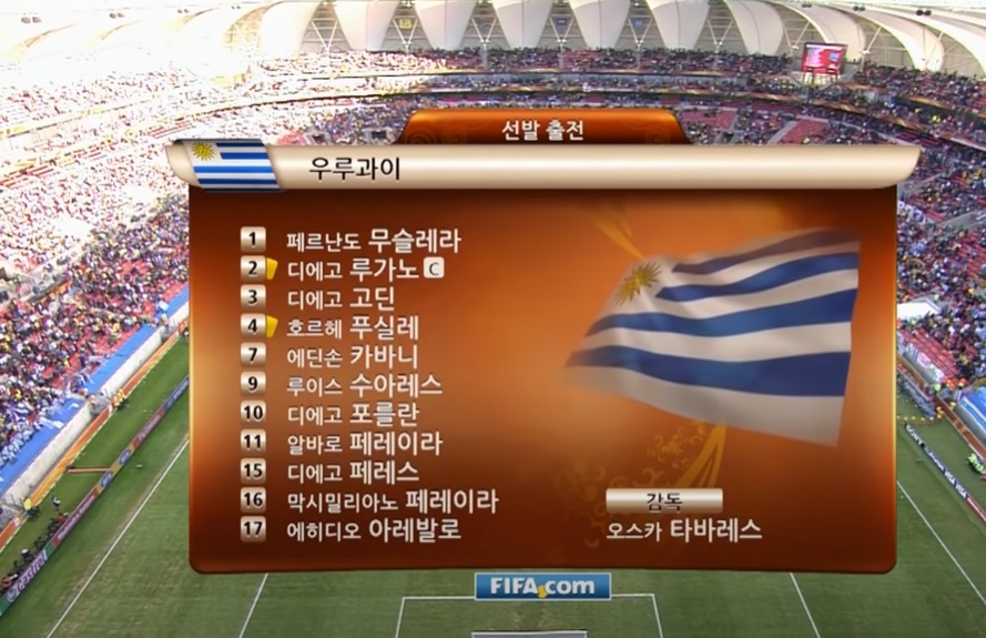 우루과이 - Fernando MUSLERA(GK), Diego LUGANO(주장), Diego GODIN(HT Mauricio VICTORINO), Jorge FUCILE, Edinson CAVANI, Luis SUAREZ(후39 Alvaro FERNANDEZ), Diego FORLAN, Alvaro PEREIRA(후29 Nicolas LODEIRO), Diego PEREZ, Maximiliano PEREIRA, Egidio AREVALO