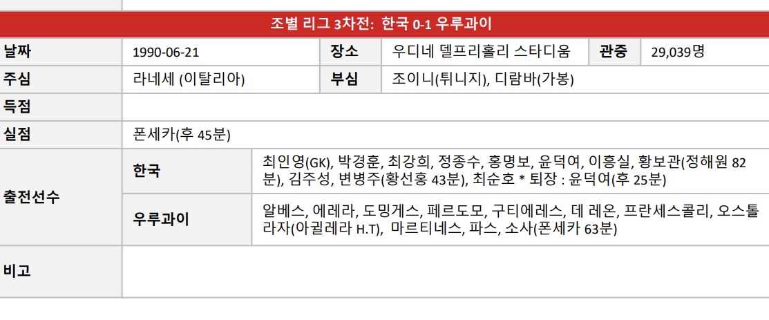 한국 우루과이 축구 경기결과 (1990년 6월21일)