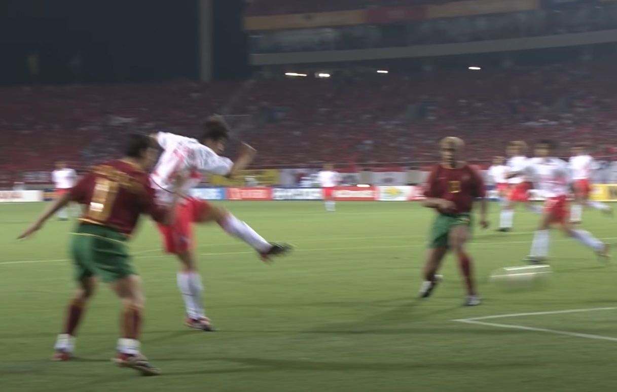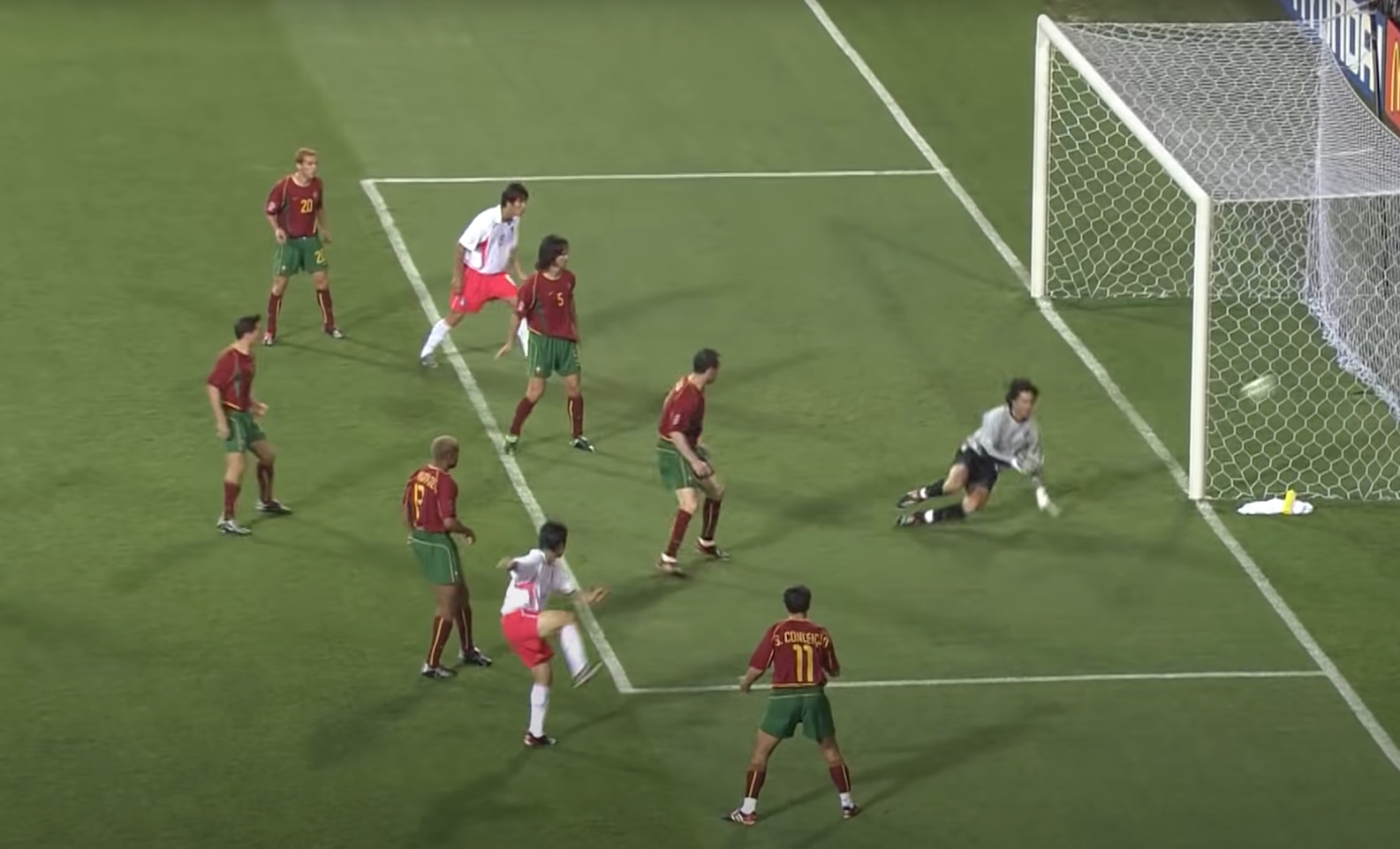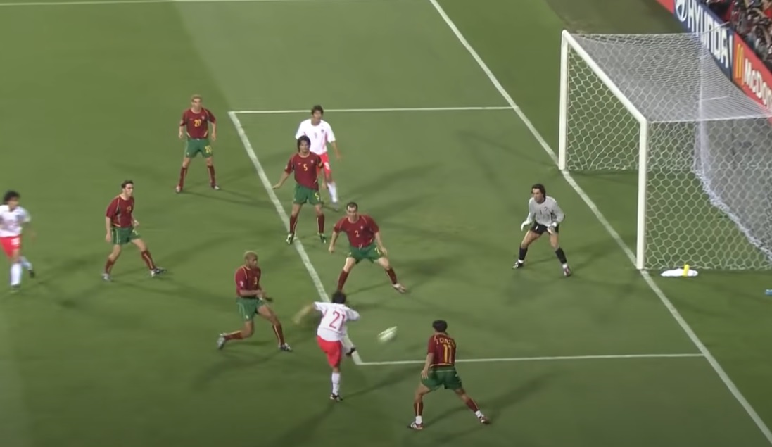 박지성 선수가 오른쪽 가슴으로 볼 트래핑하면서 왼쪽으로 볼을 띄우는 순간 박지성을 막으려던 포르투칼 대표팀의 등번호 11번 피구선수는 역동작에 걸려 두 발이 얼어 붙고 말았습니다. 그 순간 이미 등번호 21번 박지성 선수는 왼발로 골대 오른쪽을 향해 총알같은 슛을 날렸습니다.