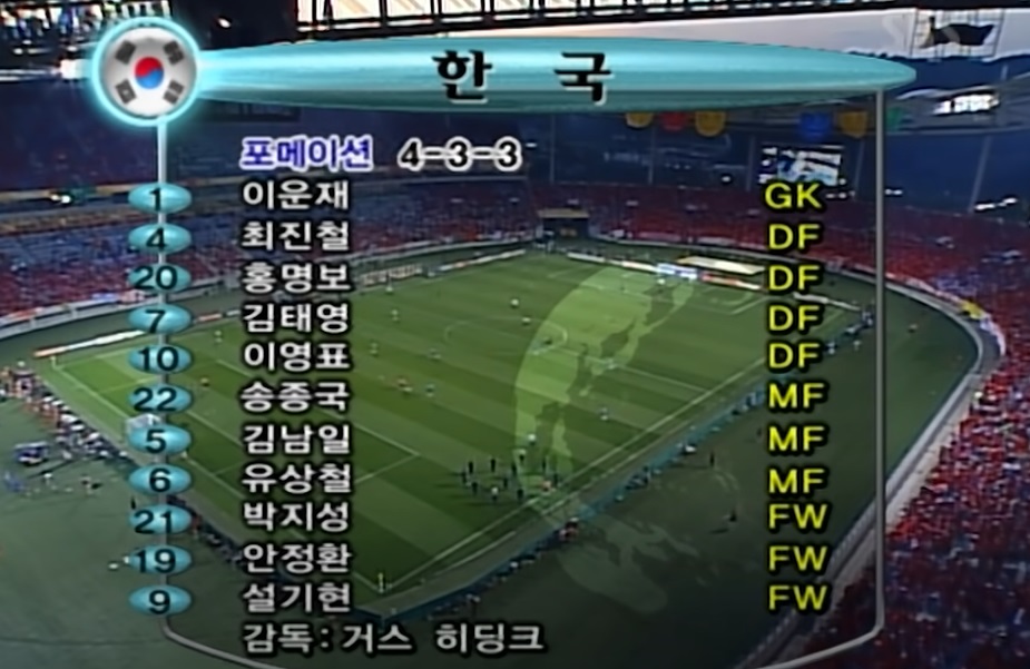 한국 - 이운재(GK), 최진철, 김남일, 유상철, 김태영, 설기현, 이영표, 안정환(이천수 93분), 홍명보, 박지성, 송종국