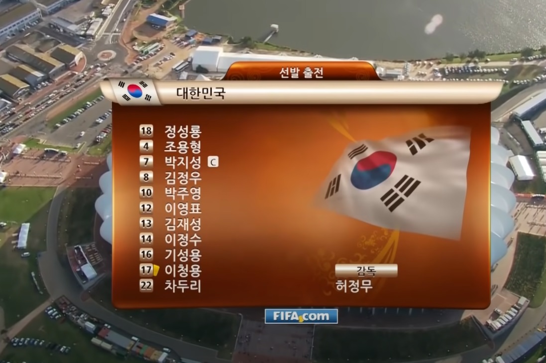 2010년 제19회 남아공 월드컵 대회는 남아프리카 공화국에서 6월 11일 ~ 7월 11일까지 개최되었으며, 한국 국가 대표팀의 최종 성적은 16강이었습니다. 당시 단장은 노흥섭, 감독은 허정무가 맡았으며, 한국팀의 조편성은 B조로 아르헨티나, 그리스, 나이지리아와 함께 편성되었으나 조별리그 1차전에서 그리스를 2:0(이정수, 박지성 골)으로 이겼습니다.