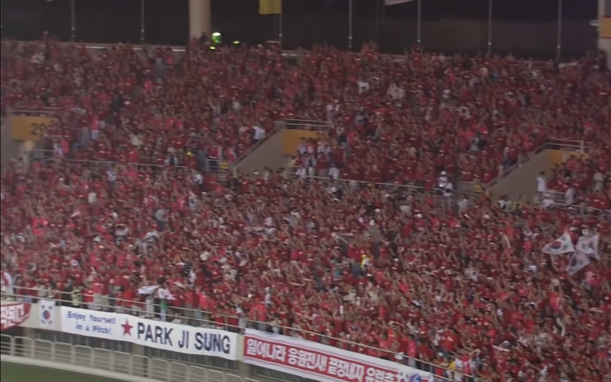 붉은 악마들(RED DEVILS)로 가득찬 한일 월드컵 당시의 월드컵 경기장. 그날 박지성 선수는 저 플랜카드를 보고 더욱 힘이 났을 것입니다.