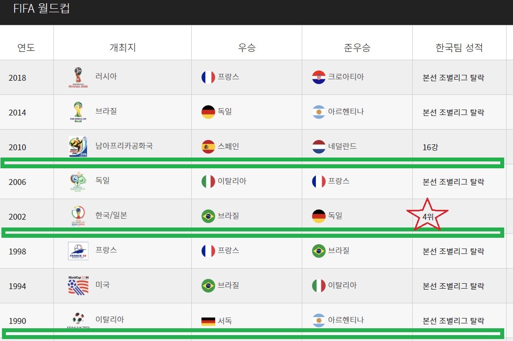 한국 남자축구 대표팀의 최근연도 역대 월드컵 성적