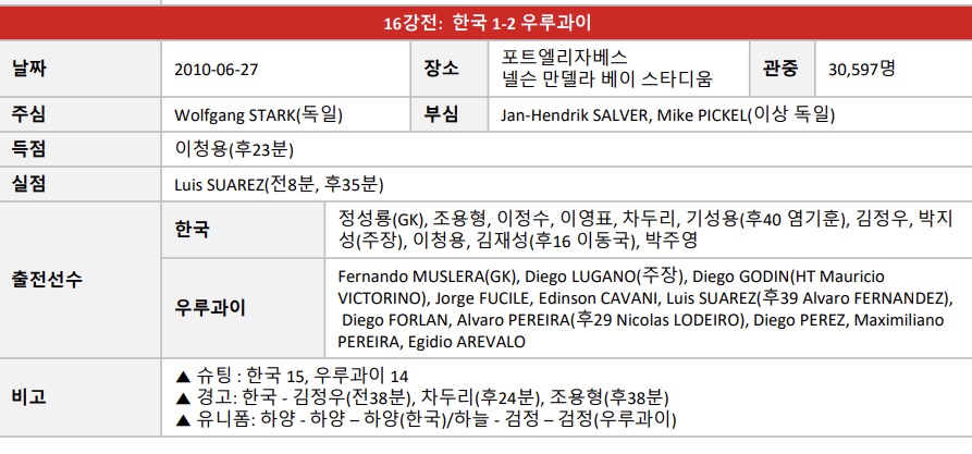 비고 ▲ 슈팅숫자 : 한국 15, 우루과이 14 ▲ 경고: 한국 - 김정우(전38분), 차두리(후24분), 조용형(후38분)