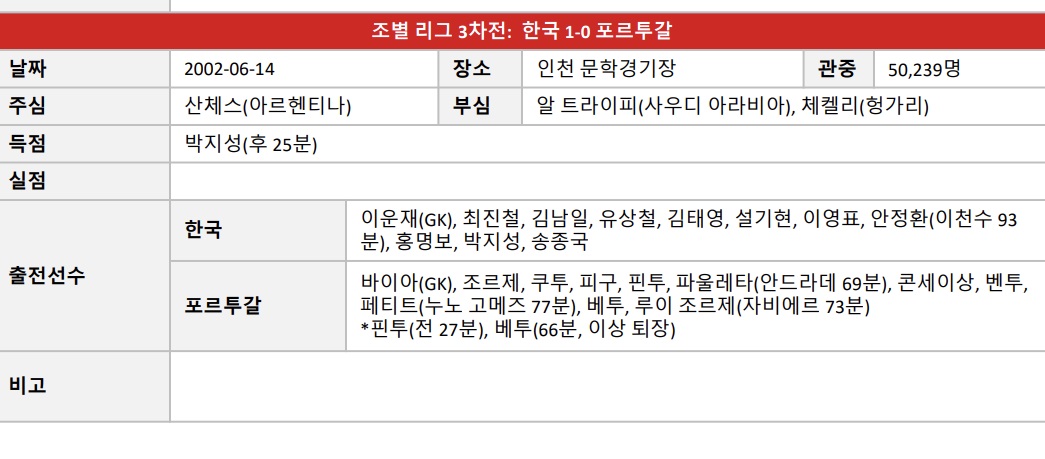 그리고 두번째는 2002년 한일 월드컵 본선 조별리그 3차전에서 포르투칼과의 경기였습니다. 과거 월드컵 조별리그에서 만나 경기를 펼친 적이 있는 한국 포르투칼, 한국 우르과이 축구 경기 결과를 살펴 보겠습니다.
