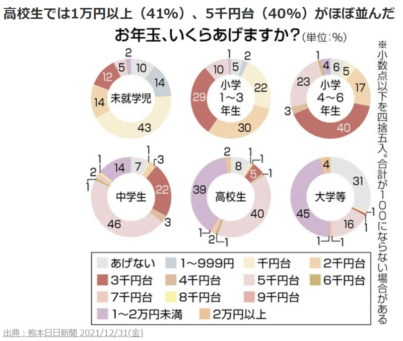 연령별 적당한 세뱃돈 금액을 물어본 결과(구마모토현, 응답자 803명)의 세부내용은 다음과 같습니다. 미취학 아동에게는 1천엔대(약 1만원, 43%)이 많았으며, 이어서 1천엔 미만과 2천엔대가 14%로 동률을 보였습니다. 아예 안준다도 응답도 약10%였습니다.