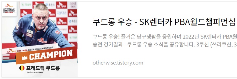 | 대한당구연맹 국토정중앙배 2022 전국당구대회 경기결과 우승상금 - 1위 허정한 나이 2위 조치연 공동 3위 황봉주 최성원 (0) | 2022.04.11 |