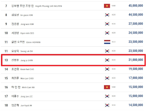 신정주 당구선수 - PBA투어 경기 상금 랭킹 (2021-22시즌)