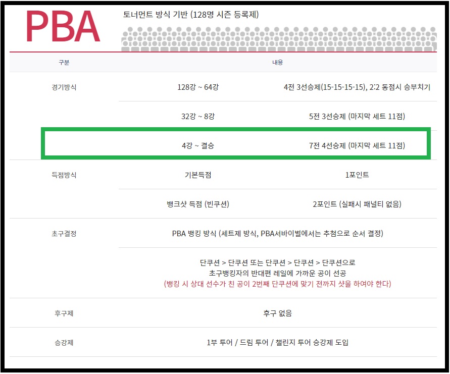 한편 이 PBA경기방식 규칙은 남자 프로당구선수들의 실력이 향상되고 참여 선수들의 저변이 확대되면서 지속적으로 강화되어 왔습니다. 예를 들면 PBA투어 최근까지도 128강전은 서바이벌 경기방식으로 진행된 적이 있습니다.