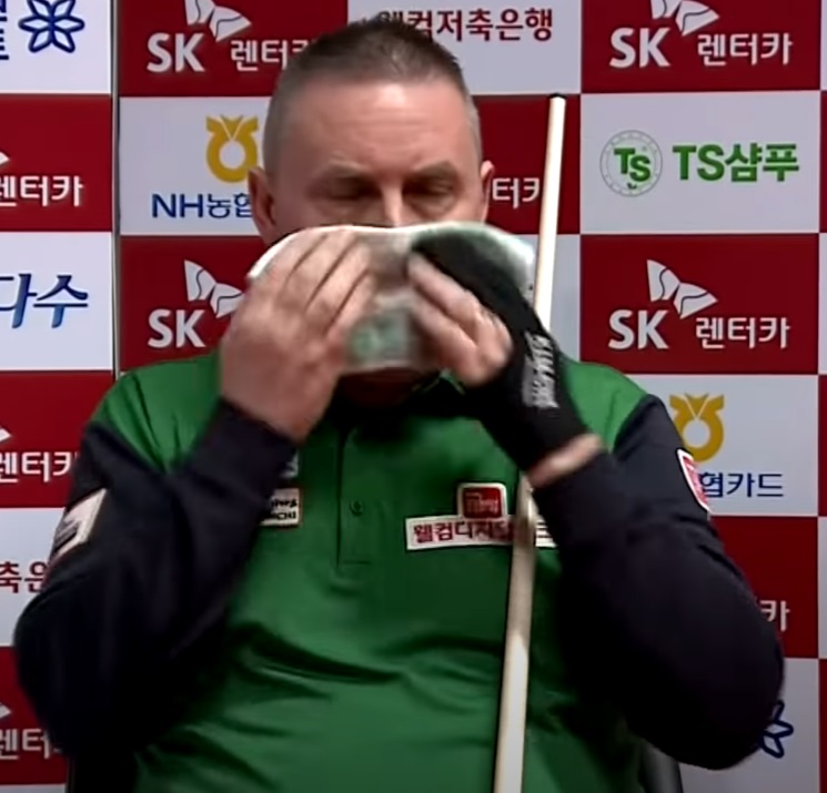 쿠드롱이라고 힘들지 않은 경기는 없었습니다. 쿠드롱 천적이라고 불리는 베트남 당구선수 마민캄을 만나서는 잔득 긴장하며 연신 땀을 닦는 모습을 보이도 앴습니다.