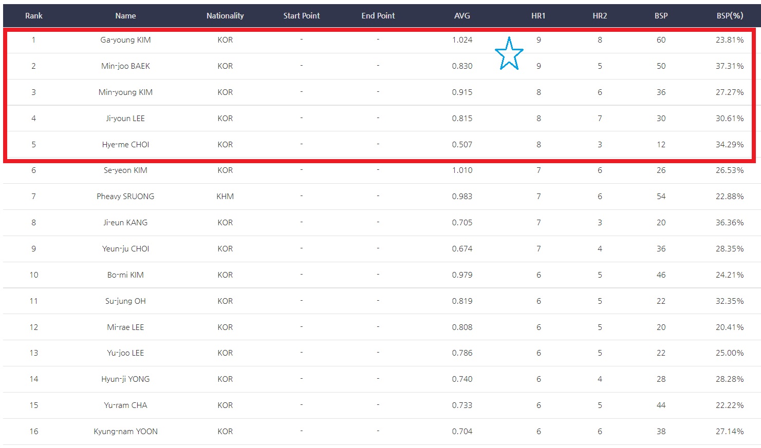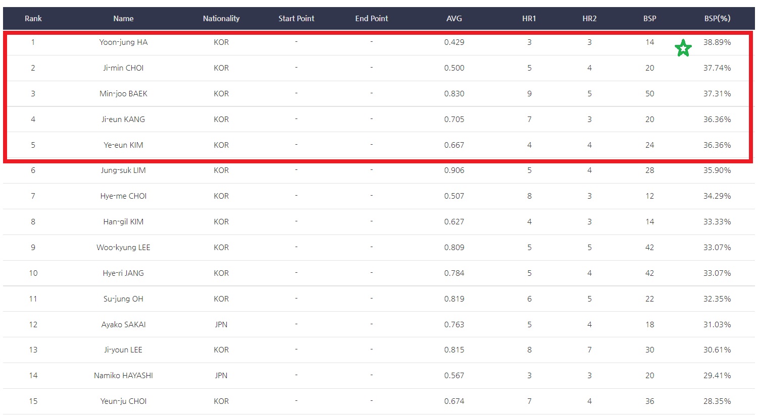 *Rank/Name/Nationality/--AVG/HR1/HR2/BSP/ BSP(%)