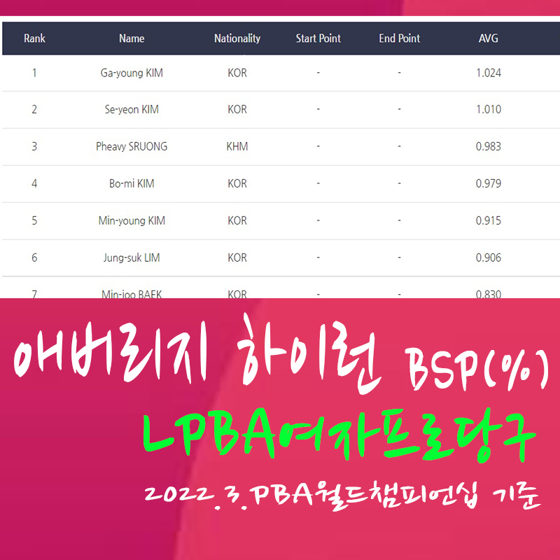 | LPBA 여자프로당구선수 애버리지 AVG 하이런 HR 뱅크샷득점 비율 BSP 랭킹 순위 (2022 PBA 월드 챔피언십 32강 기준) - 스롱 피아비 애버리지 김가영 하이런 (0) | 2022.04.19 |