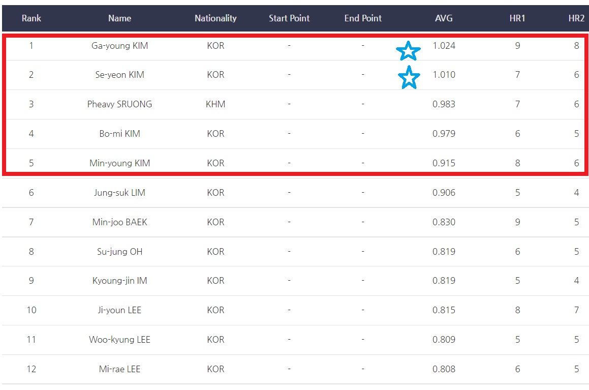 1 Ga-young KIM KOR - - 1.024 9 8 60 23.81%