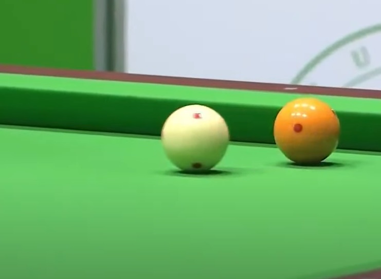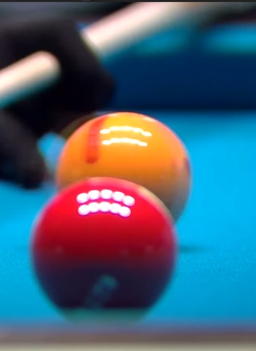 강민구 당구선수가 자신의 공(수구)로 제1목적구인 빨간공을 맞추어 옆돌려치기로 제 2목적구인 힌공을 맟추기 위해 힘차레 스트로크하는 모습입니다.