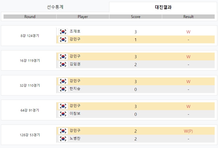 128강 53경기 : 강민구 2 W(P) 노병찬 2 -