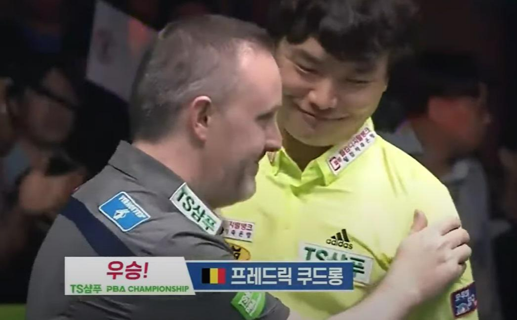 강민구 당구선수가 결승전에 만난 프레드릭 쿠드롱 당구선수에게 패배한후 쿠드롱을 축하는 모습입니다. 아마도 PBA투어에서 가장 많은 우승자를 배출한 (준우승) 선수가 아닐까 추정됩니다.