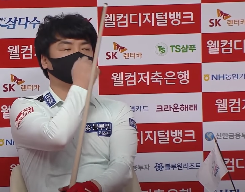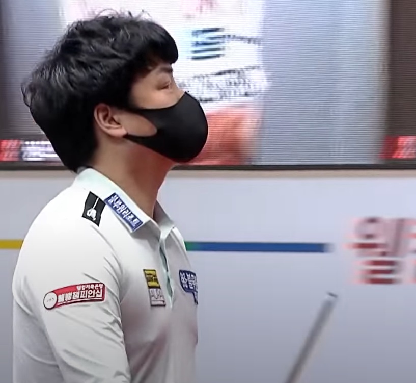 득점을 놓쳐 아쉬어 하며 자리로 돌라가는 강민구 당구선수입니다.