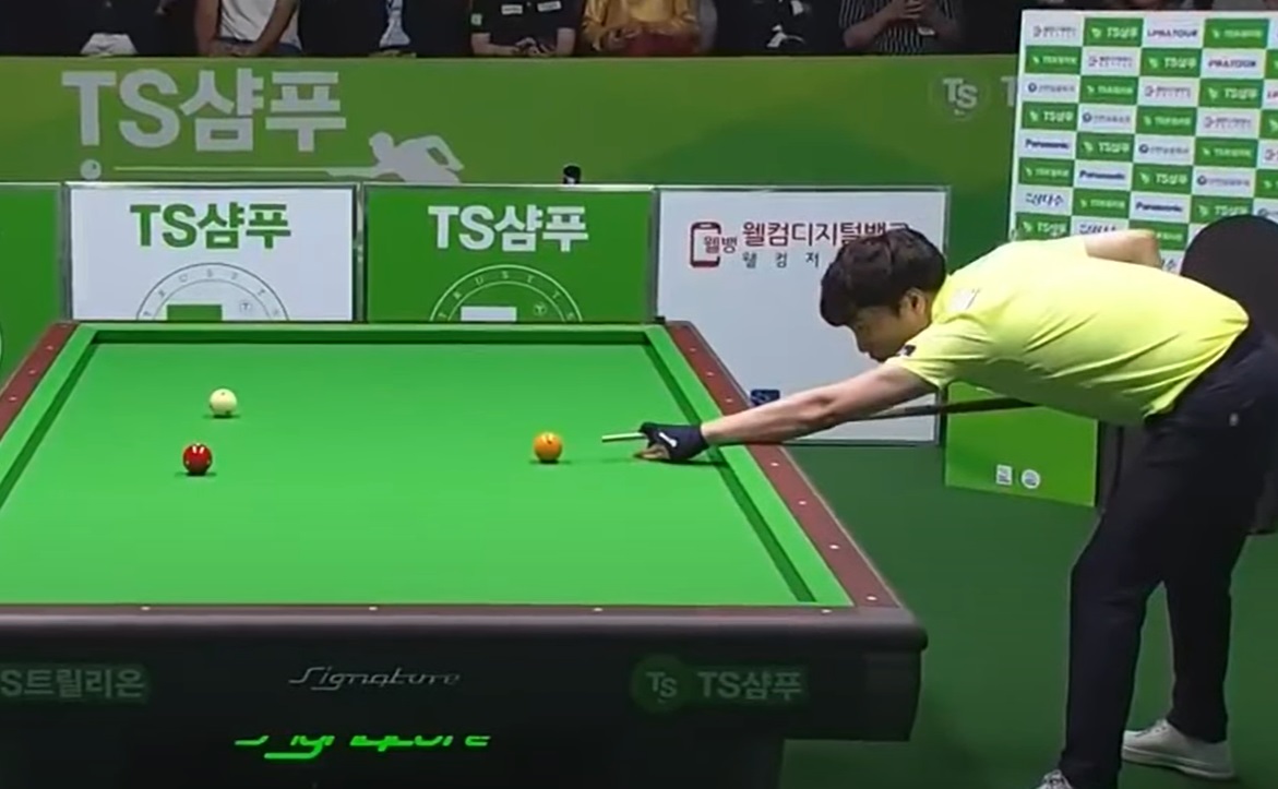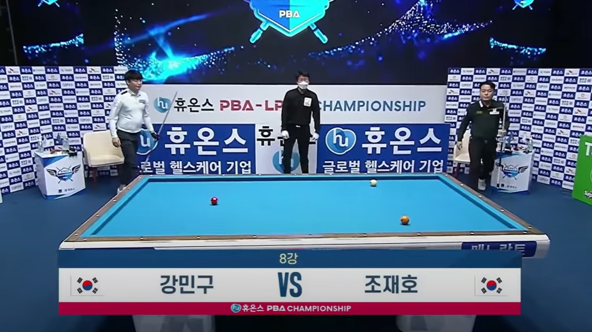 강민구 당구선수가 PBA투어에서 초구배치를 치는 모습입니다. 참조로 PBA투어의 초구배치 당구공 위치는 우리가 한국형 중대에서 또는 대대당구대에서 캐롬당구연맹 경기규칙에 따라 늘 똑 같은 위치에 공을 놓고 치는 초구배치와는 다른 당구공 배치입니다.